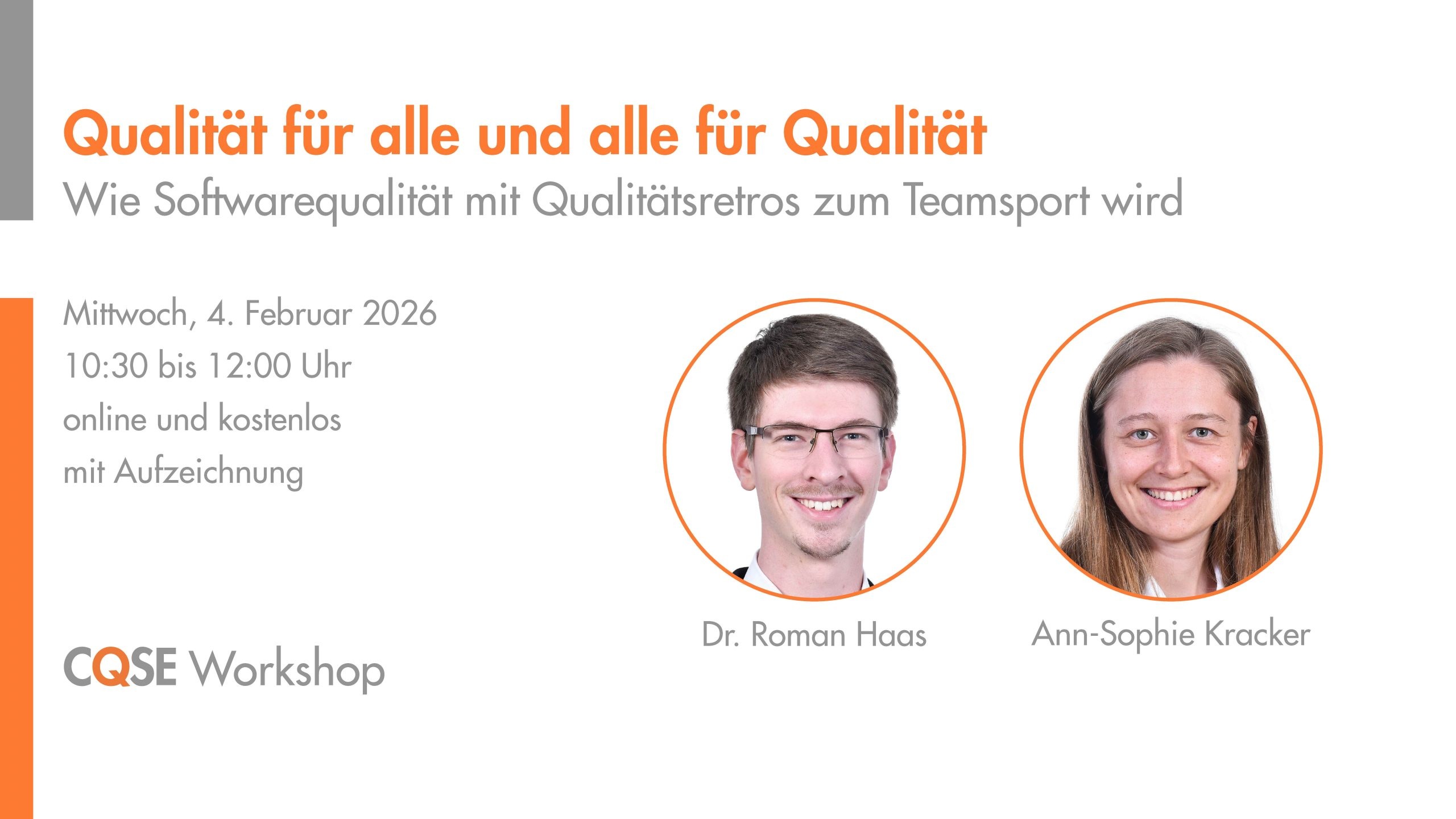 Mit Qualitätsretrospektiven erreichen Sie das! Lernen Sie im Workshop, wie Sie alle beteiligten Personen abholen, indem ihr gemeinsam regelmäßig über Qualität sprecht. Sehen Sie, wie man solche Retros aufbaut und wie unsere Kunden sie erfolgreich einsetzen. Jetzt anmelden für den kostenlosen Online-Workshop!